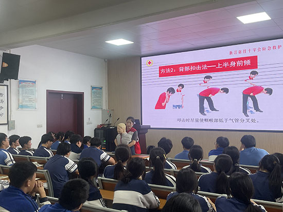 為增強學生安全意識,普及急救知識,提高應對突發狀況的能力,6月9日下午,杭州市喬司職業高級中學開展了一場以“氣道異物梗阻心肺復蘇(CPR)+AED使用”為主題的應急救護知識講座,浙江省紅十字二級講師、國家應急救援員、杭州龍晟應急救援服務中心師資組組長蔡海燕為該校高一、高二年級部分學生代表進行了應急救護常識指導培訓。