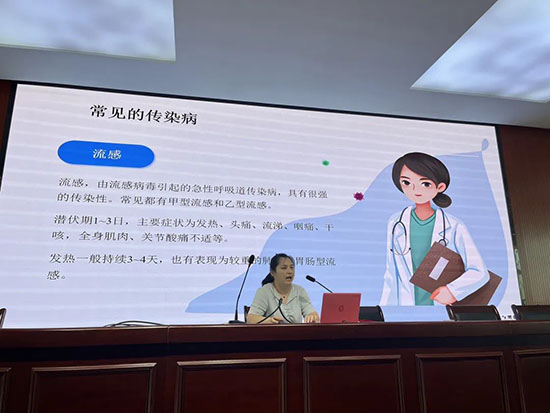 課堂上,王醫生用通俗易懂的語言向學生介紹“什么是傳染病、常見傳染病有哪些以及傳染病的預防措施等內容”。王醫生巧妙地將復雜的醫學知識轉化為同學們聽得懂、記得住的趣味語言。她借助生動的卡通圖片,像講故事般揭開了流感、水痘、肺結核等校園常見傳染病的“神秘面紗”。