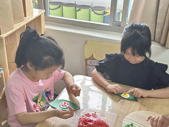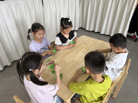 畫創(chuàng)意粽畫顯張力:畫上自己喜歡的圖案,先一折,再二折,接著三折,最后一個粽子變出來了。粘土紅豆粽:輕粘土揉一揉、按一按;再把紅豆放上去,壓一壓;接上兩片小粽葉;粘土紅豆粥就出現(xiàn)了。