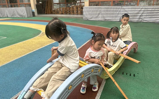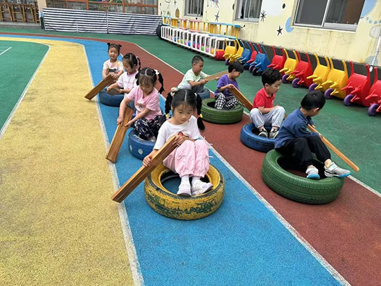 制花樣創(chuàng)搭賽龍舟:“我覺得可以用輪胎搭建龍舟。”“我們可以用小椅子一起做龍舟。”“積木塊也可以搭建龍舟。”利用多樣材料,想象創(chuàng)造,展現(xiàn)不同魅力,展示幼兒制作各具特色的三只龍舟。