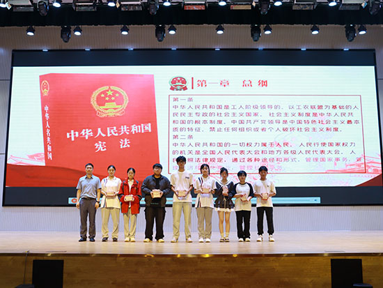 成人意味著成熟與責任,勇敢與獨立。副校長陸冬梁向學生代表贈送《憲法》讀本。紅色的讀本雖薄,承載的卻是共和國公民的神圣權利和責任。