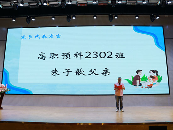 高職預科2302朱子歆同學的父親作為家長代表發言。他的發言則飽含溫情與期許,眼眶中映照出對子女成人的欣慰與囑托,希望所有的孩子都能永遠保持對生活的熱愛,勇敢地追尋自己的夢想。