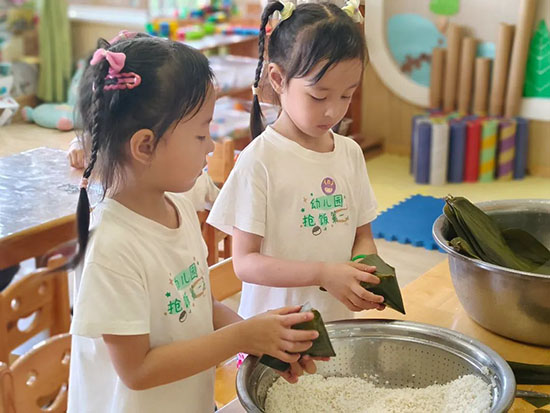 包粽子:“糯米白花花,粽葉手中拿,裹住甜蜜餡,卷起香粽葉,粽子包好啦!”在老師的指導下,幼兒們念叨著兒歌,一手拿粽葉,一手勺糯米,不忘放進不同的餡料。不一會兒,形狀不一的粽子產生了,煮熟,吃著香甜軟糯可口的粽子別提有多開心了。