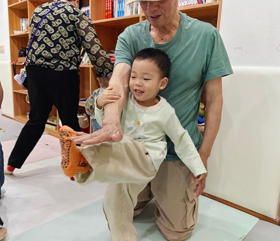 活動以宗漢社區教育中心教師團隊精心編排的熱身操拉開序幕。“小手拍拍,肩膀搭搭……”在老師清晰的指令引導下,孩子們隨著節奏完成拍手、踮腳等動作,家長們則在旁輔助配合,現場洋溢著歡快的笑聲。熱身環節既激活了幼兒肢體機能,也通過親子協同初步建立課堂規則意識。