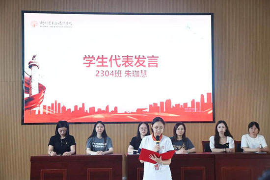 典禮在雄壯的國歌聲中拉開帷幕,全場人員肅立,鏗鏘的旋律傳遞著青年團員們赤誠的愛國之心。本期學員代表2304班朱珈慧同學在發言中倡議,全體新團員要以此為起點,在今后的學習和生活中,以共青團員的標準嚴格要求自己,勇擔時代重任。