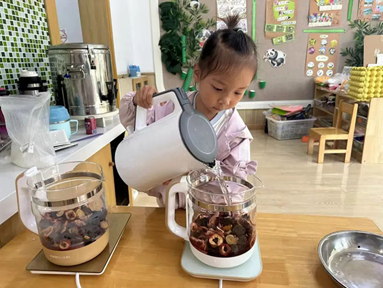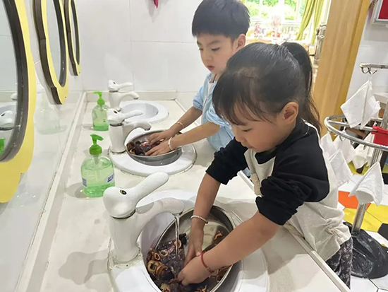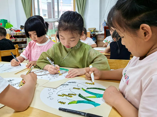 吟誦詩(shī)歌:一“收”一“種”,是一個(gè)充滿希望、萬(wàn)物生長(zhǎng)的美好節(jié)氣。“熟梅天氣豆生蛾,一見(jiàn)榴花感慨多。芒種積陰凝雨潤(rùn),菖蒲修剪莫蹉跎。”幼兒們合著節(jié)拍朗朗誦讀,跳起手勢(shì)舞,領(lǐng)略芒種節(jié)氣的物候特點(diǎn)和生活內(nèi)涵。