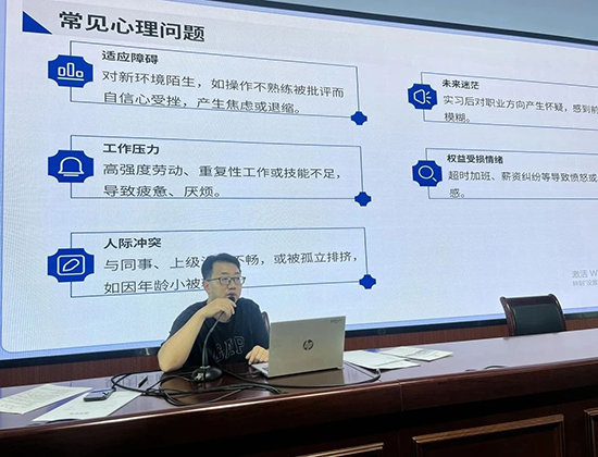 隨后,學(xué)校保障處副處長(zhǎng)倪豐從嚴(yán)守紀(jì)律紅線、筑牢安全防線及關(guān)注心理健康三大方面對(duì)學(xué)生進(jìn)行教育,并提出相關(guān)要求。倪豐重點(diǎn)解讀了《實(shí)習(xí)生頂崗實(shí)習(xí)期間違紀(jì)處理意見》,明確紀(jì)律底線;他強(qiáng)調(diào)安全是重中之重,以真實(shí)的案例來警示學(xué)生在實(shí)習(xí)期間注意生產(chǎn)安全、交通安全的重要性,警惕詐騙。他表示,如學(xué)生在實(shí)習(xí)期出現(xiàn)心理困擾,可及時(shí)聯(lián)系班主任,積極尋求幫助。