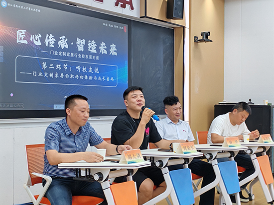 活動現(xiàn)場,浙江羅曼云家居有限公司法人胡大劍、江山市偉峰家居有限公司營銷總監(jiān)鐘華等優(yōu)秀校友們依次將自己在門業(yè)定制家居領域的職場經歷與成長故事娓娓道來。他們或分享初入行業(yè)時的艱辛探索,或講述在技術創(chuàng)新中突破瓶頸的喜悅,真摯的話語迅速拉近了與學弟學妹們的距離。現(xiàn)場氣氛持續(xù)升溫,同學們紛紛舉手提問,圍繞行業(yè)前沿崗位需求、個人職業(yè)規(guī)劃路徑、專業(yè)技能提升方法等熱門議題,與校友們展開了一場干貨滿滿的思維碰撞。