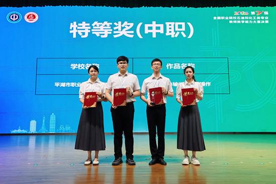 6月21日至23日,第二屆全國職業(yè)院校石油和化工類專業(yè)教師教學(xué)能力大賽決賽在河南應(yīng)用職業(yè)技術(shù)學(xué)院落下帷幕。平湖市職業(yè)中專化工專業(yè)教師團隊(沈張迪、朱奕蕾、徐舟英、蔣怡斌)憑借作品《化工流體輸送設(shè)備的操作》脫穎而出,以總分第一名的成績斬獲中職組唯一一個特等獎,是學(xué)校在該賽項上的又一次重要成果。