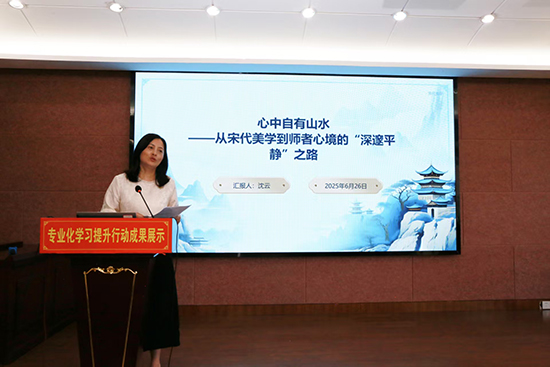 展示環(huán)節(jié)結(jié)束后,副書記孫甫永對整場活動進(jìn)行總結(jié)點評。他用“專業(yè)” 與 “深耕”兩個關(guān)鍵詞,高度概括了本次展示的核心價值。“今天的分享既是專業(yè)化閱讀的思維碰撞,更是扎根教育土壤的深度耕耘,每位老師都在用專業(yè)視角為教育實踐注入新活力。”他既肯定了教師們在專業(yè)領(lǐng)域的突破,也點明了未來專業(yè)精進(jìn)的方向。面對全體教師,他提出三點期望:一是永葆進(jìn)取之心,樹立終身學(xué)習(xí)理念;二是善用多元路徑,構(gòu)建系統(tǒng)學(xué)習(xí)體系;三是堅持知行合一,推動成果實踐轉(zhuǎn)化,讓個體成長帶動群體進(jìn)階。