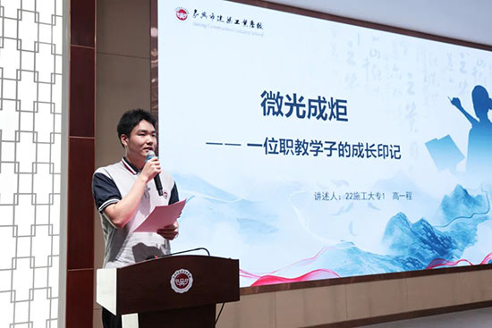 “教育是靈魂喚醒靈魂的事業(yè)。”在故事分享環(huán)節(jié),22施工大專1班畢業(yè)生高一程以“追光者”的視角,深情講述了在校期間多位黨員教師以“匠心”點(diǎn)亮學(xué)生技能成長(zhǎng)之路的動(dòng)人故事。班主任邵國(guó)平老師也隨后上臺(tái),表達(dá)了對(duì)高一程同學(xué)的祝福,也現(xiàn)場(chǎng)分享了自己的育人心得。師生之間的分享,傳遞著教育的溫暖與力量,彰顯了黨員教師的責(zé)任與擔(dān)當(dāng)。