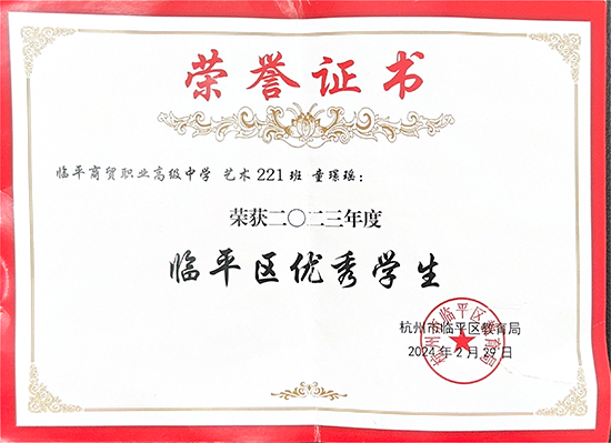 童璟瑤,杭州市臨平商貿(mào)職業(yè)高級中學2022級藝術(shù)設(shè)計與制作專業(yè)學生。她成績優(yōu)異,學業(yè)成績和專業(yè)成績?nèi)昙壍谝弧?023學年榮獲臨平區(qū)高中學生假日杯學科學科素養(yǎng)提升活動數(shù)學c組二等獎;2022年臨平區(qū)假日杯作文競賽一等獎;2023年校技能節(jié)英語演講三等獎;2023年度臨平區(qū)優(yōu)秀學生;2022學年獲得校“青荷標兵”榮譽稱號;2024年度杭州市優(yōu)秀學生。