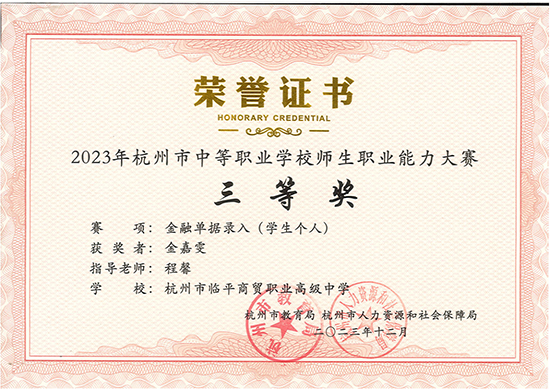 金嘉雯,杭州市臨平商貿(mào)職業(yè)高級中學2022級金融事務(wù)專業(yè)學生。她成績優(yōu)異,學業(yè)成績和專業(yè)成績名列前茅。2023年杭州市中等職業(yè)學校師生職業(yè)能力大賽金融單據(jù)錄入三等獎;2023年杭州市中等職業(yè)學校師生職業(yè)能力大賽金融產(chǎn)品營銷三等獎;2023年臨平區(qū)中職師生職業(yè)能力比賽金融單據(jù)錄入二等獎;2023年度臨平區(qū)優(yōu)秀學生;2023年第十一屆校園技能節(jié)基礎(chǔ)知識問答項目一等獎;2023年第十一屆校園技能節(jié)票據(jù)錄入項目一等獎;2024年第十二屆校園技能節(jié)職高數(shù)學解題能力大賽一等獎;2024年第十二屆校園技能節(jié)會計電算化三等獎。