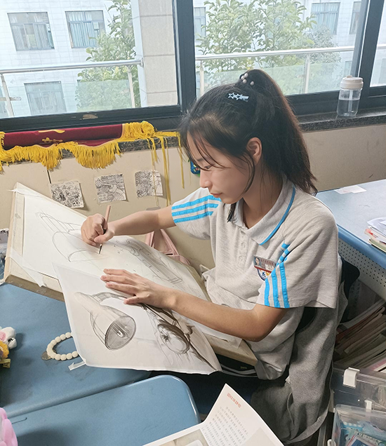【破繭時刻】畫室成為她的諾亞方舟,素描線條是重建世界的經(jīng)緯。當午休的同學追逐嬉鬧時,她的鉛筆正與畫紙進行著長達三小時的密談;深夜的畫室里,那些被揉皺的草稿紙,其實是蛻下的舊繭。數(shù)學公式與英語單詞開始在她的速寫本邊緣發(fā)芽,竟開出區(qū)作文競賽一等獎的奇異花朵。