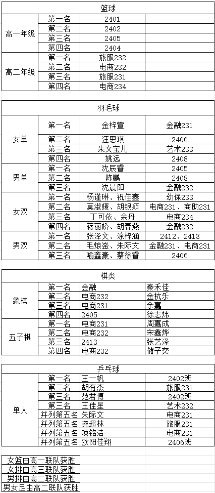 經過激烈角逐,各個項目的獲獎名單終于揭曉。以下是本次青荷體育節的獲獎名單: