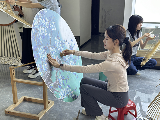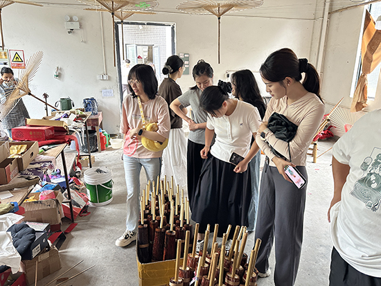 在金竺非遺館內,青年教師們認真聆聽了非遺傳承人對富陽油紙傘歷史和制作工藝的講解。富陽油紙傘以其獨特的72道工序聞名,凝聚了世代匠人的智慧與心血。隨后,在傳承人的指導下,老師們親身參與了油紙傘的制作環節。大家動手體驗了傘面繪制、傘面裱糊等關鍵步驟。看似簡單的操作,實則考驗著耐心與技巧。老師們專注投入,親手感受著每一道工序的精細與不易。當一把把親手參與制作的油紙傘最終成型時,現場充滿了成就感與喜悅。這次沉浸式的體驗,讓青年教師們直觀地領略了傳統手工藝的精湛,深刻體會到“匠心”的深刻內涵。