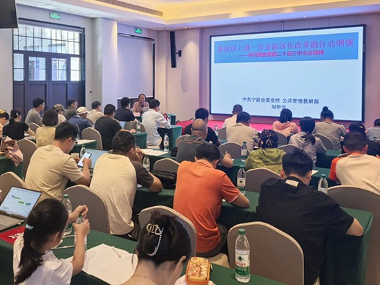 分班授課環(huán)節(jié),中層干部班聚焦管理與育人,寧波出版社社長袁志堅傳授突發(fā)事件應(yīng)對和網(wǎng)絡(luò)輿情引導(dǎo)策略,寧波第二技師學(xué)院副院長吳旭亞分享三全育人典型學(xué)校建設(shè)管理經(jīng)驗,探索黨建與思政融合路徑。紀(jì)檢干部班緊扣監(jiān)督與創(chuàng)新,寧波市委黨校主任劉華安解讀中國式現(xiàn)代化與黨的二十屆三中全會精神,明確監(jiān)督執(zhí)紀(jì)的改革方向;寧波市委黨校副教授吳新林深入闡釋新時代意識形態(tài)工作的重要性,筑牢思想防線。