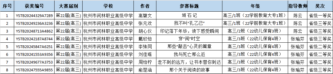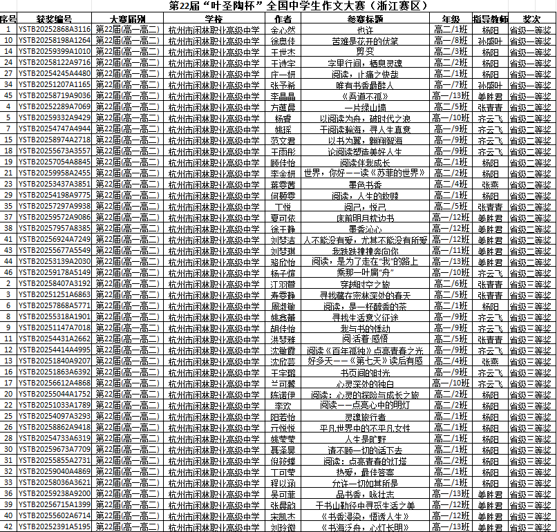 近日,在第22屆“葉圣陶杯”全國中學生新作文大賽省級評選中,杭州市閑林職業高級中學學子以斐然的文學才華和深厚的文化底蘊再創佳績,共計54篇佳作脫穎而出,榮膺省級獎項。其中,8篇作品斬獲一等獎,19篇榮獲二等獎,27篇獲得三等獎。尤為矚目的是,由楊陽老師精心指導的金心然同學憑借其獨具匠心的作品成功晉級全國總決賽,為學校爭得殊榮。這一系列耀眼成績,不僅展現了學校學子卓越的文學創作能力,更彰顯了學校“五育并舉”育人理念下素質教育的豐碩成果。