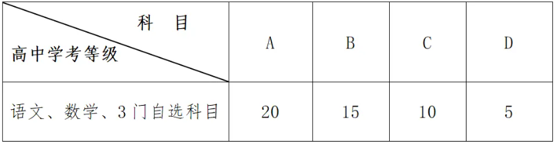 普高招生考生普通高中學業(yè)水平考試(學考)折算成績由2門必選科目+3門自選科目組成,五門科目成績進行折算,不同等級換算成相應分值,滿分為100分。必選科目為語文、數(shù)學,三門自選科目從外語、物理、技術、政治、歷史、地理、化學、生物中選擇學考等級最優(yōu)的三門。高中學考等級以浙江省教育考試院提供的成績?yōu)闇?,學考等級是外省獲得的,須提供學籍所在省的省級機構出具或簽署意見的學業(yè)水平考試成績證書或證明(原件)。換算如下表: