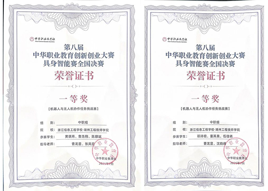在剛剛落幕的第八屆中華職業(yè)教育創(chuàng)新創(chuàng)業(yè)大賽具身智能賽全國決賽中,浙江信息工程學校·湖州工程技師學院電氣中本23兩支代表隊,在“機器人與無人機協(xié)作任務挑戰(zhàn)賽”項目中,一舉斬獲全國一等獎第1名和第2名。