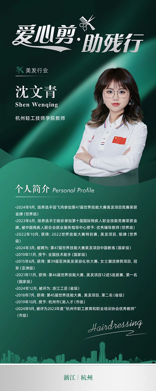 拱墅區“愛心剪·助殘行”公益活動現場,杭州輕工技師學院教師沈文青俯身與輪椅上的王阿姨輕聲交流,手中剪刀精準落下。這位曾站上世界技能大賽領獎臺的95后姑娘,此刻正將她的頂尖技藝化作助殘暖流。