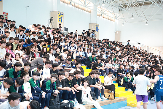中場休息期間,本次賽事MC、校體育組陳超老師組織現(xiàn)場觀眾進(jìn)行三分球投籃活動,同學(xué)們踴躍參與,弧線劃過穹頂?shù)那宕嗳刖W(wǎng)聲與吶喊助威聲交織,氣氛熱烈。