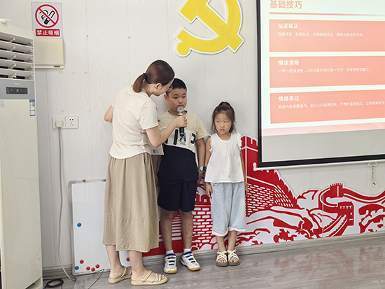 在朗誦技巧小課堂上,老師從站姿儀態(tài)、吐字清晰度到情感表達(dá)等方面進(jìn)行了基礎(chǔ)指導(dǎo)。通過“四聲歌”、口部操、氣息訓(xùn)練等趣味互動練習(xí),孩子們在輕松愉快的氛圍中逐步掌握了朗誦要領(lǐng)。