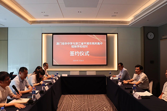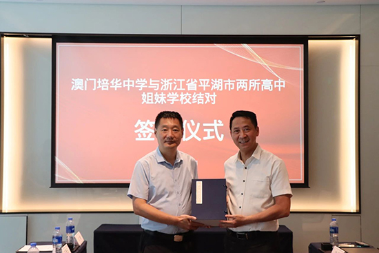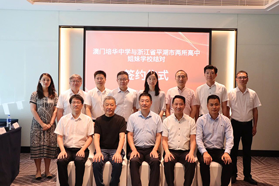2025年7月16日,在平湖市委常委、市委統戰部長沈志林的帶領下,市委統戰部副部長、市僑辦主任、市僑聯主席夏潔弘,市教育局黨委書記、局長徐立,黨委委員、總督學王獻,市僑聯專職副主席汪瀟云與平湖市當湖高級中學、平湖市職業中等專業學校主要負責人赴廣東珠海,參加浙江省平湖市兩所高中與澳門培華中學締結姐妹學校簽約儀式。