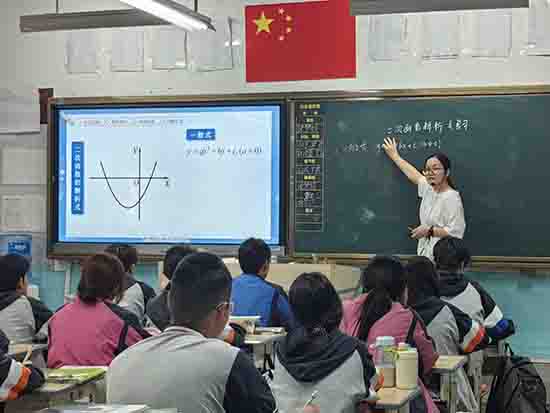 劉君偉老師立足“數形結合”,設計了一堂情境浸潤、探究鮮明的實踐課。 她以“跳臺滑雪”為現實主線貫穿教學:開篇借冬奧場景導入二次函數最值問題,激發興趣;繼而運用拋物線動態圖像,引導學生重溫頂點、對稱軸等核心知識,滲透模型認知與生活實際的聯系。在典例探究中,她分層推進一題多解,引導學生探究起跳角度與飛行距離的函數關系,深化策略創新與模型應用能力。最終,學生回歸跳臺實際問題,綜合運用函數性質優化軌跡設計,在求解“最遠飛行距離”的挑戰中,實現從數學建模、運算求解到最優決策的演變過程。