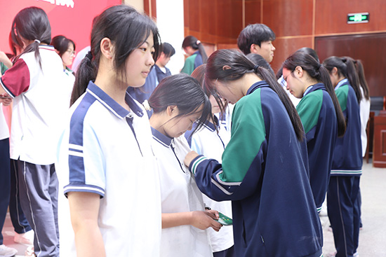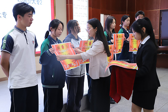 代表發言結束后,劉葉海副校長為第26期業余黨校學員頒發結業證書。老團員代表為新團員佩戴團徽、頒發團員證,熠熠生輝的團徽,承載著組織的期望與重托,象征著責任與擔當的傳遞。