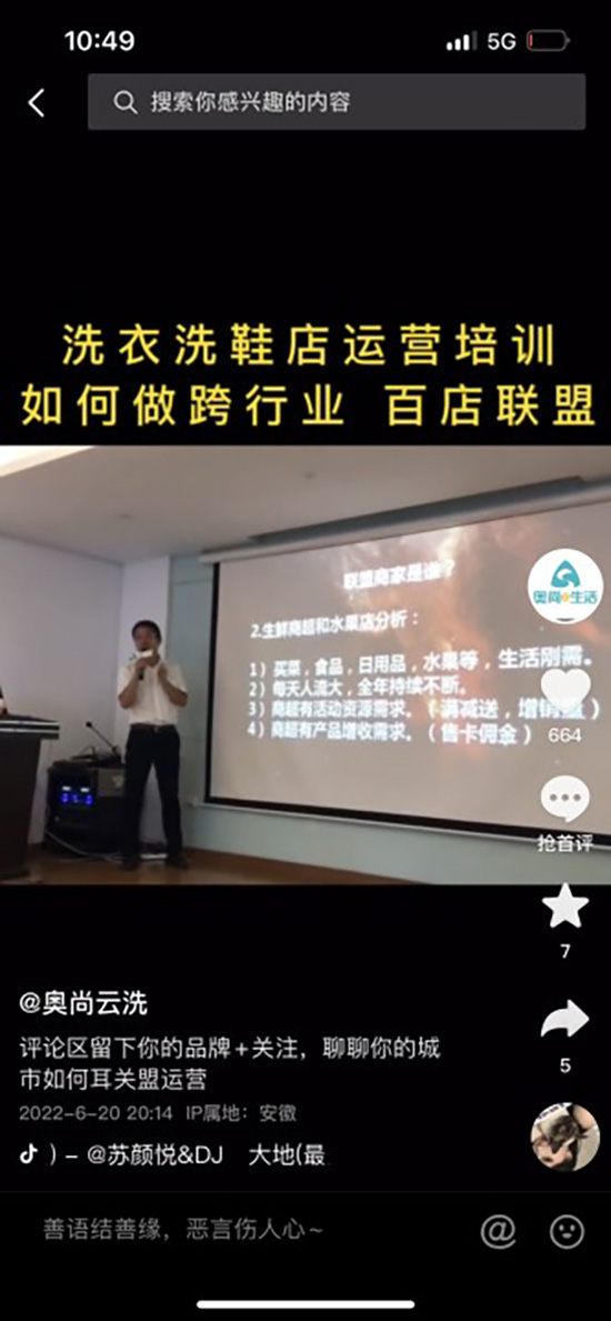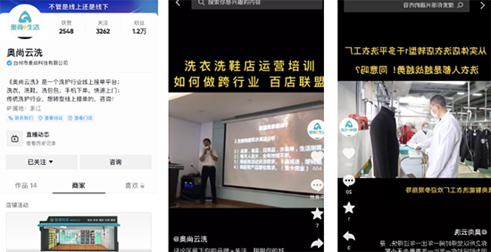 朱溪鎮社區學校通過與臺州奧尚科技有限公司等企業合作,拓寬培訓資源,為學員們介紹智能洗衣,解決傳統干洗店無法提供“24小時”服務的弊端,強化村民市場運營觀念和能力。同時朱溪鎮社區學校與臺州市奧尚科技有限公司攜手成立校外培訓實踐基地,增設實體店體驗項目、運營實習項目以及加盟連鎖幫扶項目,三大項目有效的提升了培訓實效。2022年,雙方加深協作,為洗染行業提供線上線下技能與運營培訓,同時打造抖音“浙江洗衣洗鞋,浙里洗”線上平臺獨立入口,為洗染行業經營戶提供線上抖音直播培訓培訓和運營幫扶服務,突破傳統行業服務店鋪周邊2公里的業務局限,不斷向全省市拓展,甚至服務全國業務。如圖所示:共富課堂奧尚云洗培訓抖音直播。