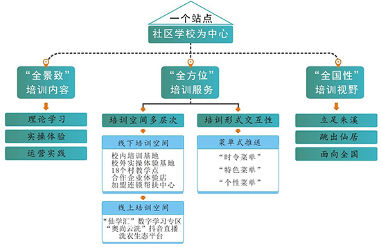 以朱溪鎮現代化社區學校服務中心為培訓“主陣地”,創新機制,整合培訓資源,利用數字化手段,革新培訓形式,融合理論指導、現場實操體驗、進企業從業實習、加盟連鎖幫扶等為一體,創設“全景致”的培訓內容,“全方位”的培訓服務,“全國性”的培訓視野,實現從學習到實踐到運營“一條龍”式的培訓,努力為學員帶去更便利、更實用、更高效的培訓服務,真正實現“強村富民,服務百姓”的辦學理念。