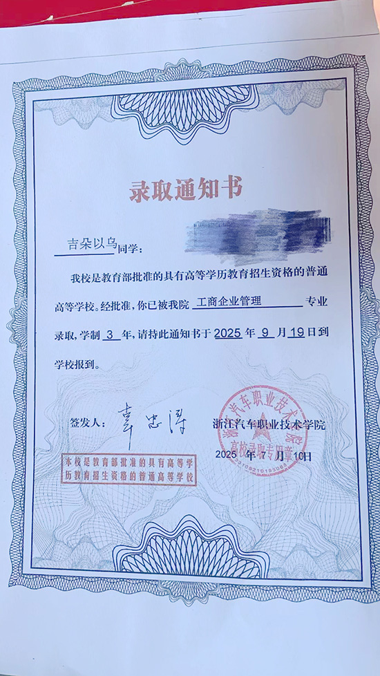 與吉朵以烏一同圓夢大學的,還有會計專業的阿都拉洛——這位彝族姑娘順利被浙江廣廈建設職業技術大學大數據與財務管理專業錄取。“考前的焦慮,考后的緊張,出成績前的忐忑不安,現在終于拿到了錄取通知書,這就是努力付出最好的回報。在大學期間我想繼續好好學習,努力考證。”拉洛在給母校的留言中深情地說到,“感謝寧波給了我看世界的窗口,更給了我改變命運的鑰匙。也非常感謝一直以來幫助關心我的老師和叔叔阿姨們。未來我還想留在北侖工作,用專業知識回報這座溫暖的城市。”