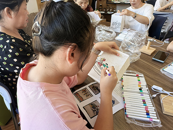 活動伊始,特邀本地漁民畫非遺傳承人鄭紅飛老師進行現場指導。工作人員提前備好白色素面燈罩、丙烯馬克筆等創作材料。鄭老師通過展示精美的漁民畫燈成品,為大家生動講解漁民畫的用色特點與主題內涵,幫助“一老一小”不同年齡段的參與者迅速領略這一民間藝術的獨特魅力。