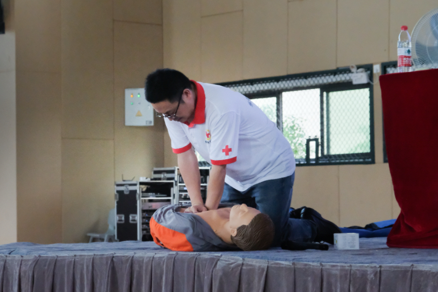 培訓中,鄭友文主任圍繞心肺復蘇的技術要點和操作規范展開了系統講解。他重點強調了“黃金四分鐘”在心搏驟停救援中的關鍵意義,并詳細演示了CPR的標準流程,包括現場環境評估、意識判斷、緊急呼救、胸外按壓、開放氣道和人工呼吸等環節。在講解人工呼吸的具體方法和胸外按壓的技術要領時,鄭主任借助教學模擬人進行了標準操作示范,明確按壓位置、深度、頻率及人工呼吸的配合方式,特別強調了胸外按壓與人工呼吸的比例為30:2的重要原則。