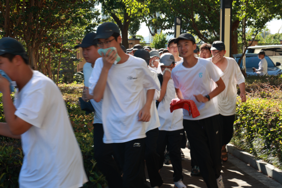 下午,校園內警報聲劃破寧靜,消防演練正式啟動。教官迅速在宿舍區多個點位施放環保煙霧彈,橙黃色濃煙沿著樓道迅速蔓延,模擬真實火情場景。學生們立即進入應急狀態,低頭彎腰,用濕毛巾捂住口鼻,在教官清晰有力的口令和老師們的現場引導下,按照預定路線快速有序疏散。女生從靜姝樓分批下樓,穿過和合橋時步伐緊湊卻不推擠;男生從宿舍出發,沿食堂前空地快速行進,師生之間呼應有序,彼此提醒“注意腳下”“跟緊隊伍”。班主任們守候在樓梯拐角和安全出口,揮動手臂引導方向,不斷喊道:“往這邊走!”“不要慌,保持距離!”“注意臺階!”整個疏散過程忙而不亂、銜接緊密,展現出師生高度配合的團隊意識和訓練有素的應急能力。