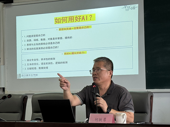 何鐵勇作題為《課題研究方案設計的“保姆級”教程——選題視角和框架解讀》的講座。以評點楓橋鎮洪綬小學《“蓮韻”文化賦能:農村小學生品格養成教育的路徑研究》課題研究方案入手,從“今天你AI 了嗎? ”“什么是課題研究? ”“為什么要做課題研究?”“課題申報通知解讀”四個方面引經據典進行剖析,在講到“AI”時,強調“AI僅僅只是輔助——文本組織、結構優化。切不可完全依賴!”當提到“課題研究就是教師用‘研究’的方式去‘干活’,目的是做得更明白、更高效、更有成就感。其核心是‘問題即課題,教學即研究,成長即成果’”時,在座教師深有同感,知曉了搞課題研究絕不是完成任務,而是提升自我。何鐵勇重點解讀《課題申報通知》,從“選題命題”“框架解讀”“方案設計 ”三個維度結合具體案例、文件要求、自身實踐進行一一指導,讓每一位在座教師獲益匪淺,為自己今后開展課題研究明確了方向與路徑。正如教師阮明俐所說:“何老師的講座很具體,很實用,以后開展課題研究不再盲目了!”何鐵勇在“勤奮使你變得優秀 研究讓你走向卓越”聲中結束講座。