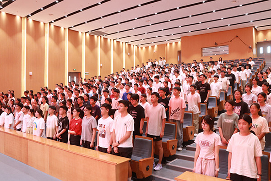 上午9時,開學典禮在莊嚴的國歌聲中拉開帷幕,全體師生肅立,雄壯的歌聲回蕩在報告廳內,也激蕩在每個學子的心中。