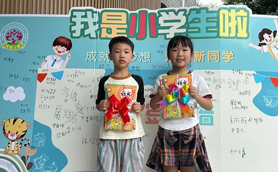 簽名寫下來日方長。簽名墻前,新生們一筆一劃認真寫下自己的名字,筆跡稚嫩,寫滿對未來的無限期待,承載著對新身份的認同和對小學生活的向往,正式成為了學校中的一員,夢想從這里啟航。