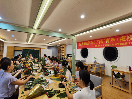 9月7日晚,夜幕降臨,安吉縣社區教育學院遞鋪分院的校園內卻依舊熱鬧非凡,新時代市民(青年)夜校如期開課,為當地青年群體帶來了一場充實又有趣的學習盛宴。本次夜校精心開設了傳統插花、葫蘆絲、抖音直播三門特色課程,吸引了來自安吉縣各個村、鎮、社區的80多位學員踴躍參與,大家懷揣著對知識與技能的渴望,共同開啟了當晚的學習之旅。