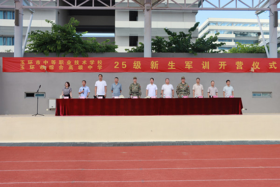9月7日上午,玉環市中等職業技術學校、玉環市綜合高級中學2025級新生軍訓開營儀式在學校田徑場隆重舉行。校黨總支書記張昌森,校長吳德章,海山鄉武裝部部長徐偉,楚門鎮人武部副部長趙冰峰,副校長陳順宇、顏申君、吳永勝、張炳良、金松、楊帆,工會主席華平飛等校領導參加。儀式由金松主持。