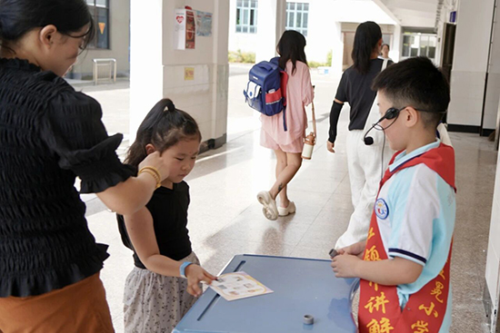 打卡校園:新生們從紅領巾小小講解員手中領取了精美的“游園卡”。在家長的陪伴下,手持游園卡,開啟了校園“發現之旅”。七個精心設計的打卡點,將學校深厚的“賢文化”底蘊融入其中:校訓碑“見賢思齊”。在小小講解員的介紹下,新生們第一次清晰了解校訓“見賢思齊”,合影留念,將校訓精神深植心間。三賢廣場(開筆禮)。“學習三賢精神,努力爭做王冕小賢士!”小小講解員的話語點燃了新生們心中的向往。“開筆禮”環節,新生們在家長的陪伴下執筆落墨,書寫人生首字“人”——撇捺間詮釋“見賢思齊”真諦。以筆墨為舟,載小賢士駛向知理明德的新航程。體藝館。“強健的體魄是成為小賢士的基礎!以后我們會常來這里鍛煉身體噠!”新生們感受運動的魅力。書畫樓。吳俊朋老師和小小講解員們向新生們展示書畫的魅力:“作為王冕學子,我們要寫好字!看,這些都是哥哥姐姐們的優秀作品!”墨香四溢的環境,激發了新生們對藝術的興趣。黨建廣場。小小講解員們在這里向新生們講述學校的歷史:“了解學校,熱愛學校,也是小賢士的責任哦!來,和王冕爺爺一起合一個影吧!”歷史和笑容在此刻交匯。衛生室。趙雙楠老師帶著小小講解員貼心地介紹著:“這里是守護我們健康的地方,不舒服了記得告訴老師來這里找醫生阿姨。”新生們在校園里,健康有保障。