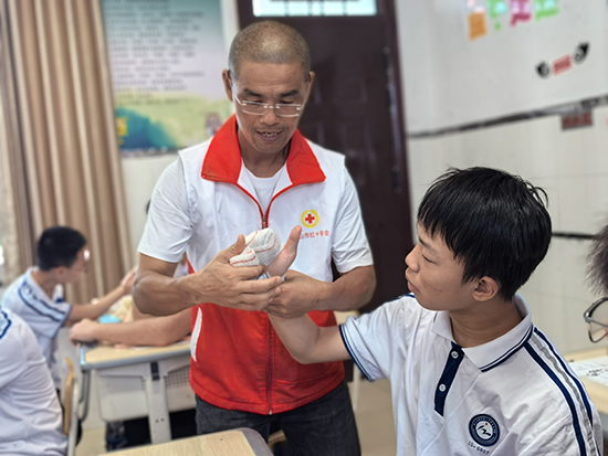 次日培訓重點轉向創傷包扎技能。課程伊始,講師結合校園生活中常見的擦傷、扭傷、出血等場景,開展創傷包扎理論教學,詳細講解三角巾、繃帶的材質特點、使用方法,以及頭部、手臂、腿部等不同部位的包扎技巧,同時強調 “先止血、后包扎,避免二次傷害”的急救原則。