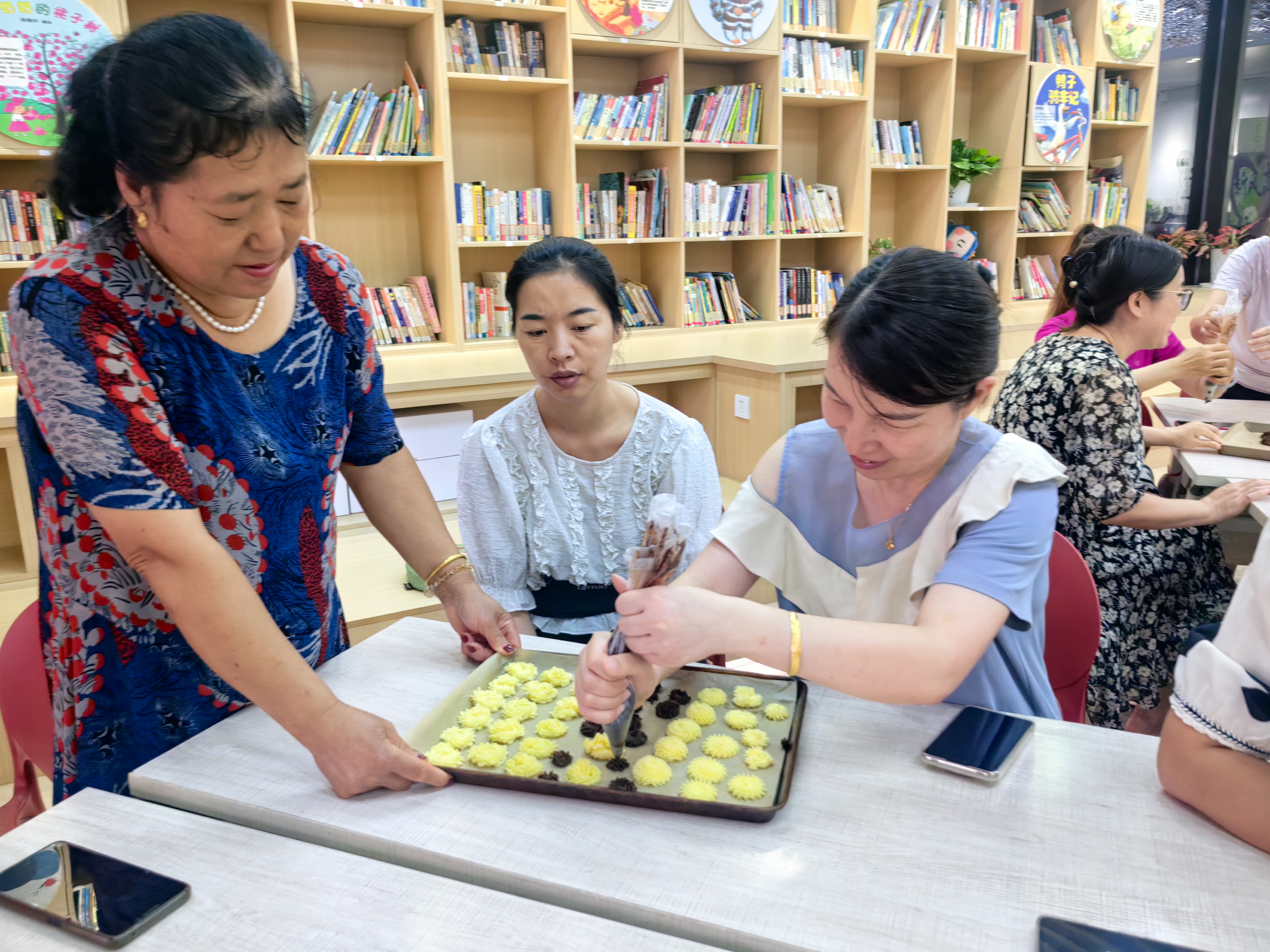 課堂上,老師介紹了制作曲奇餅干過程中所需食材、設備和工具,現場演示制作過程。大家認真地學習,個個躍躍欲試,在老師的指導下,居民朋友們興致勃勃地開始動手制作屬于自己的獨特曲奇餅干。將黃油和白糖攪拌均勻,倒入低筋面粉、糖粉、奶粉,攪拌均勻,把面糊裝入安有裱花嘴的裱花袋中,在烤盤中擠出曲奇花紋。經過一道道工序和居民們一絲不茍的創作,一盤盤金黃酥脆的曲奇餅干新鮮出爐。大家是第一次做曲奇,在嘗到了親手制作的美味可口的曲奇后,大家臉上洋溢著幸福甜蜜的笑容。
