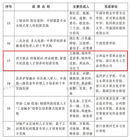 近日,浙江省教育廳正式公布2025年浙江省教書育人杰出貢獻獎名單。云和縣中等職業技術學校的教學成果《四方聯合?四維聯動?四品聯塑:新型木玩技能人才培養的創新實踐》榮獲教學成果獎一等獎!這是學校繼2017年、2021年兩度獲得教學成果獎后,在職業教育創新發展道路上的又一次重要突破。