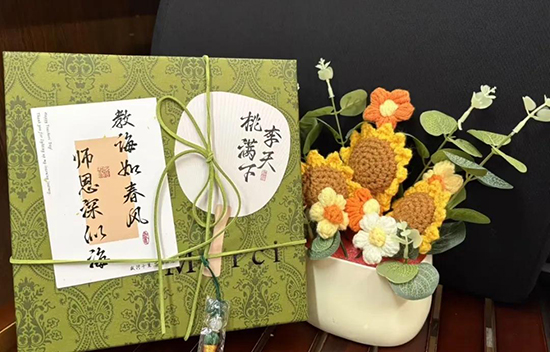 教師節前夕,校領導化身“驚喜使者”,將向日葵和精致茶食禮盒,逐一擺放在每位教職工案頭。教師節當日推開辦公室門,這份突如其來的心意,讓每位教職工的幸福感從清晨開始蔓延。