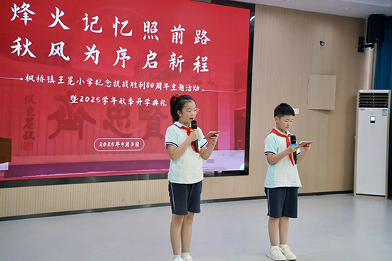 9月3日上午,諸暨市楓橋鎮(zhèn)王冕小學(xué)以“烽火記憶照前路 秋風(fēng)為序啟新程”為主題,同步開展紀(jì)念中國人民抗日戰(zhàn)爭暨世界反法西斯戰(zhàn)爭勝利80周年活動與2025年秋季開學(xué)典禮,全體師生齊聚主會場——報告廳與34個班教室分會場,在莊嚴(yán)與期盼中開啟新學(xué)期的篇章。