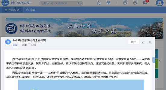 9月15日至21日是國家網絡安全宣傳周,為深入學習宣傳貫徹習近平總書記關于網絡強國的重要思想,積極響應湖州市教育系統網絡安全宣傳周活動,浙江信息工程學校·湖州工程技師學院開展以“網絡安全為人民,網絡安全靠人民——以高水平安全守護高質量發展”為主題,開展了一系列豐富多彩的宣傳教育活動。