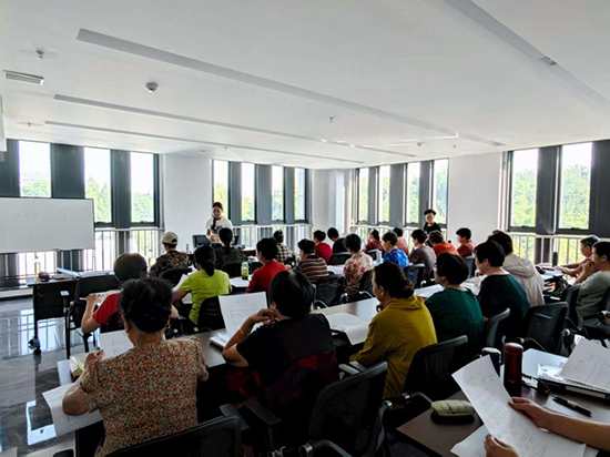 課堂上,丁老師耐心細(xì)致,從基礎(chǔ)的發(fā)聲技巧講起,手把手指導(dǎo)學(xué)員們調(diào)整氣息、把握節(jié)奏。學(xué)員們熱情高漲,認(rèn)真跟隨老師的講解反復(fù)練習(xí),即便有些學(xué)員此前毫無音樂基礎(chǔ),也在輕松愉快的氛圍中逐漸找到感覺。現(xiàn)場年齡最大的學(xué)員已 78 歲,雖頭發(fā)花白,但眼神中滿是對音樂的熱愛與學(xué)習(xí)的專注,全程緊跟課堂節(jié)奏,不愿錯過任何一個知識點。?