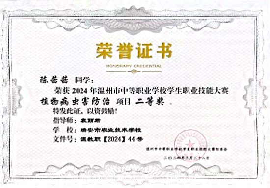 曾獲獎項:2024年浙江省植物病蟲害防治二等獎,國家獎學金,多次獲得校級獎學金,軍訓標兵,校級藝術節硬筆書法二等獎